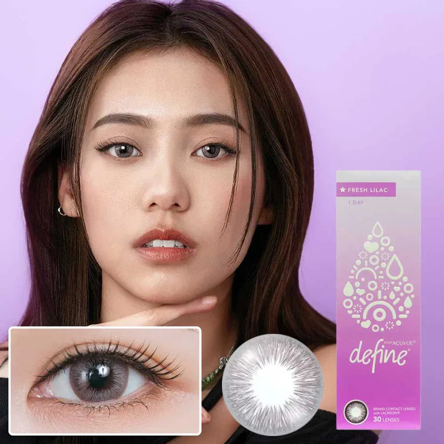 Transform your eyes with 1-Day Acuvue Define Fresh Lilac contact lenses, featuring a captivating lavender-gray hue and LACREON® Technology for up to 20 hours of comfort. With UV protection and a natural, translucent design, these daily disposable lenses enhance your eyes’ elegance for any occasion.