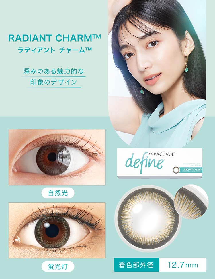 1-Day Acuvue Define Radiant Charm is a daily disposable colored contact lens designed with a 3-color blended pattern to create a deep, enchanting grey-toned look while blending naturally with your iris. Featuring BWIC™ pigment enclosure and LACREON® moisture technology, it also includes Class 2 UV blocking for everyday wear.