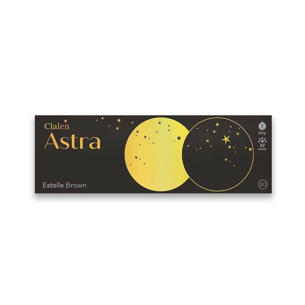 Clalen Astra Estelle Brown daily disposables combine a warm brown frame with delicate gold pearl glitter and a 13.0 mm graphic diameter (14.2 mm total) for subtle eye enlargement and natural sparkle. Made of HEMA hydrogel with 55% water content and an 8.6 mm base curve for all-day comfort.