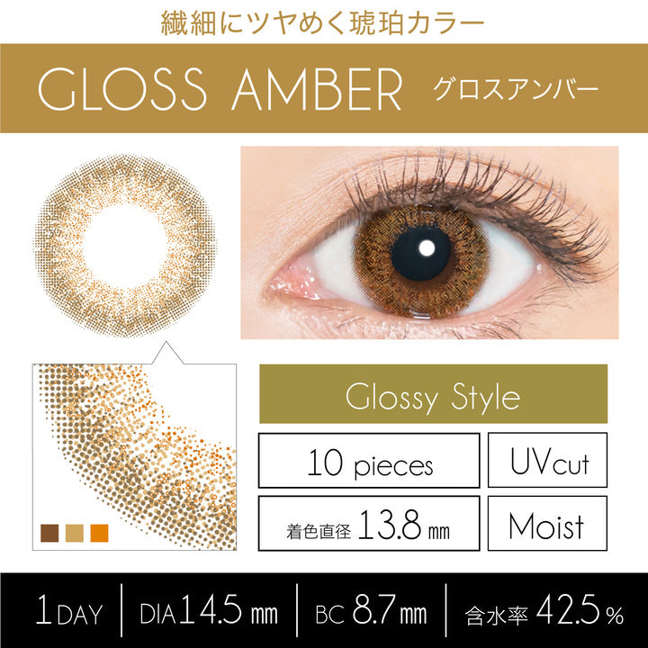 Tri-tone amber & beige under a soft brown ring give a glossy, bright finish. The 13.8 mm graphic enlarges gently for radiant, natural eyes.