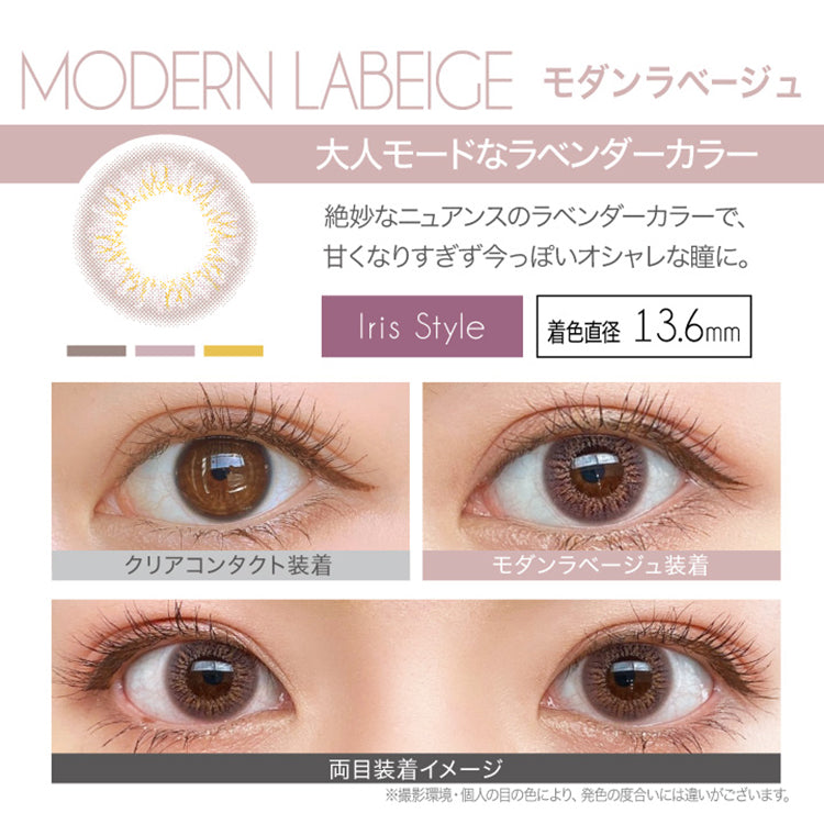 Lavender-beige gradation with a fine dot pattern for chic, translucent eyes. A modest 13.6 mm color ring keeps enlargement refined and natural.