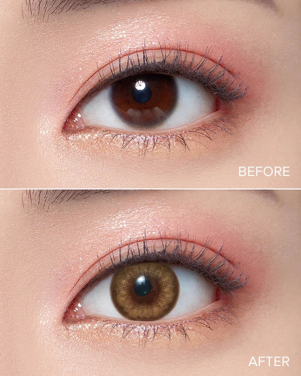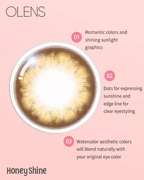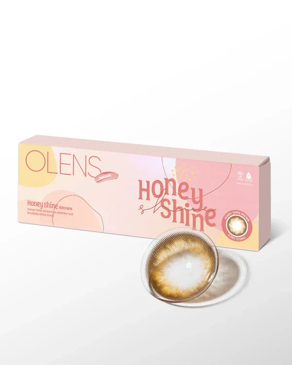 The OLENS 1 Day Honey Shine Brown lenses are designed to elevate your eyes with subtle sophistication: Constructed from PUSCON for superior moisture retention and comfort (48% water content), the lenses feature a 13.5 mm graphic diameter within a 14.2 mm total diameter, offering a natural yet visible enlarging effect. The soft brown hue and delicate, sunlight-themed watercolor pattern infuse the eyes with warmth and glow, blending elegantly with your natural iris. With a base curve of 8.7 mm, you can expect a comfortable fit throughout daily wear. These lenses deliver a refined, radiant look that feels both everyday-friendly and aesthetically striking.