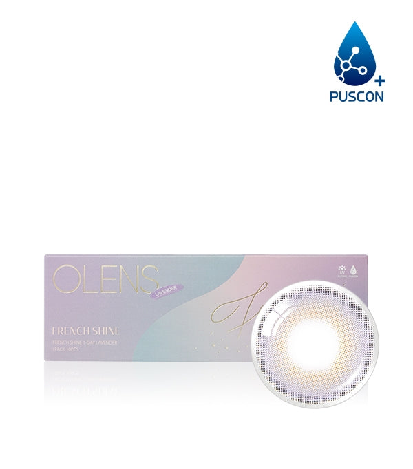 OLENS 1-Day French Shine Lavender lenses blend advanced PUSCON hydrogel and 48% water content with a delicate lavender-gold gradation. Engineered with precise 14.2 mm DIA, 13.2 mm G.DIA, and 8.7 mm BC dimensions, and offered in a hygienic 10 day disposable pack (plano to -8.00 D), they deliver radiant, natural eye enhancement and all-day comfort.