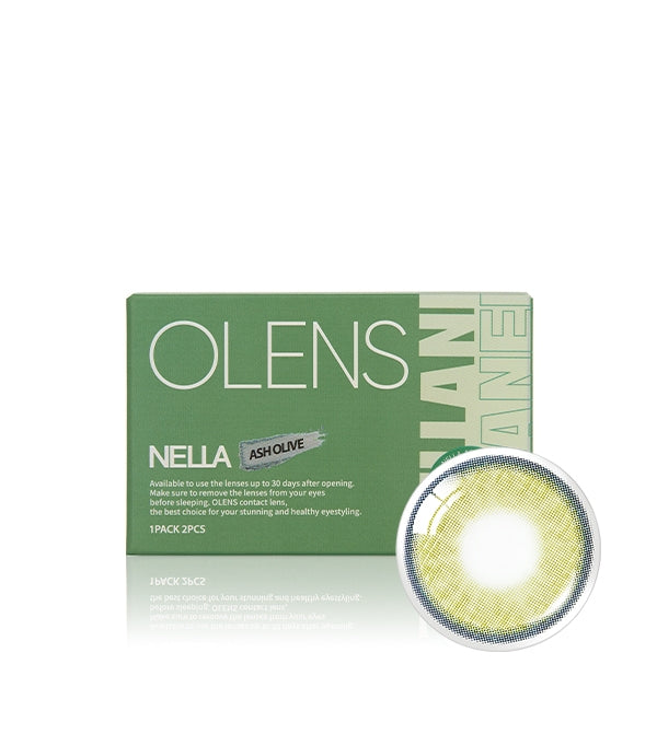 OLENS Nella Ash Olive lenses pair breathable HEMA hydrogel and 38% water content with a dreamy ash-olive gradient for a natural eye - enhancing look, offering subtle enlargement, a secure fit, and a convenient monthly 2 pack design.
